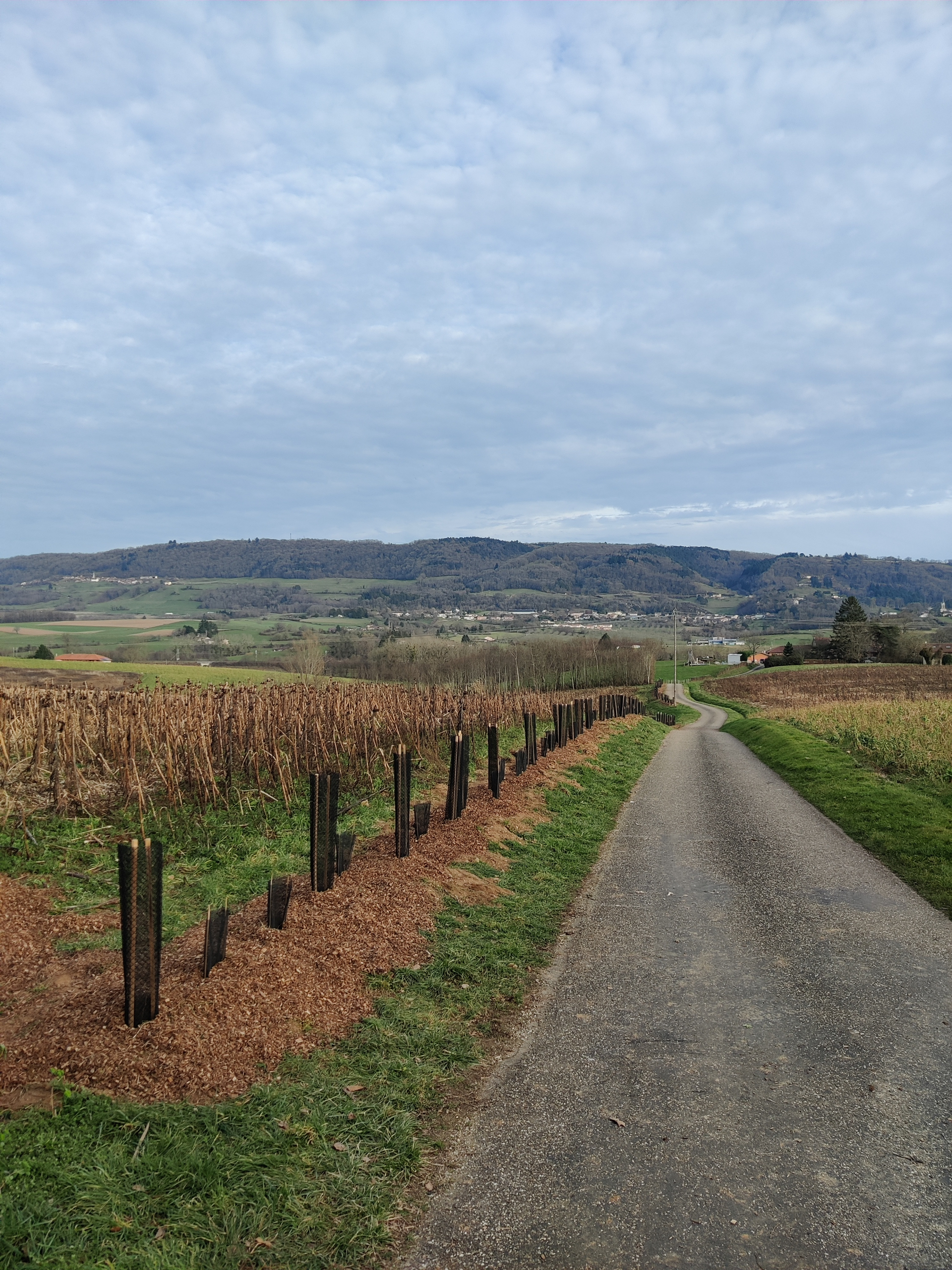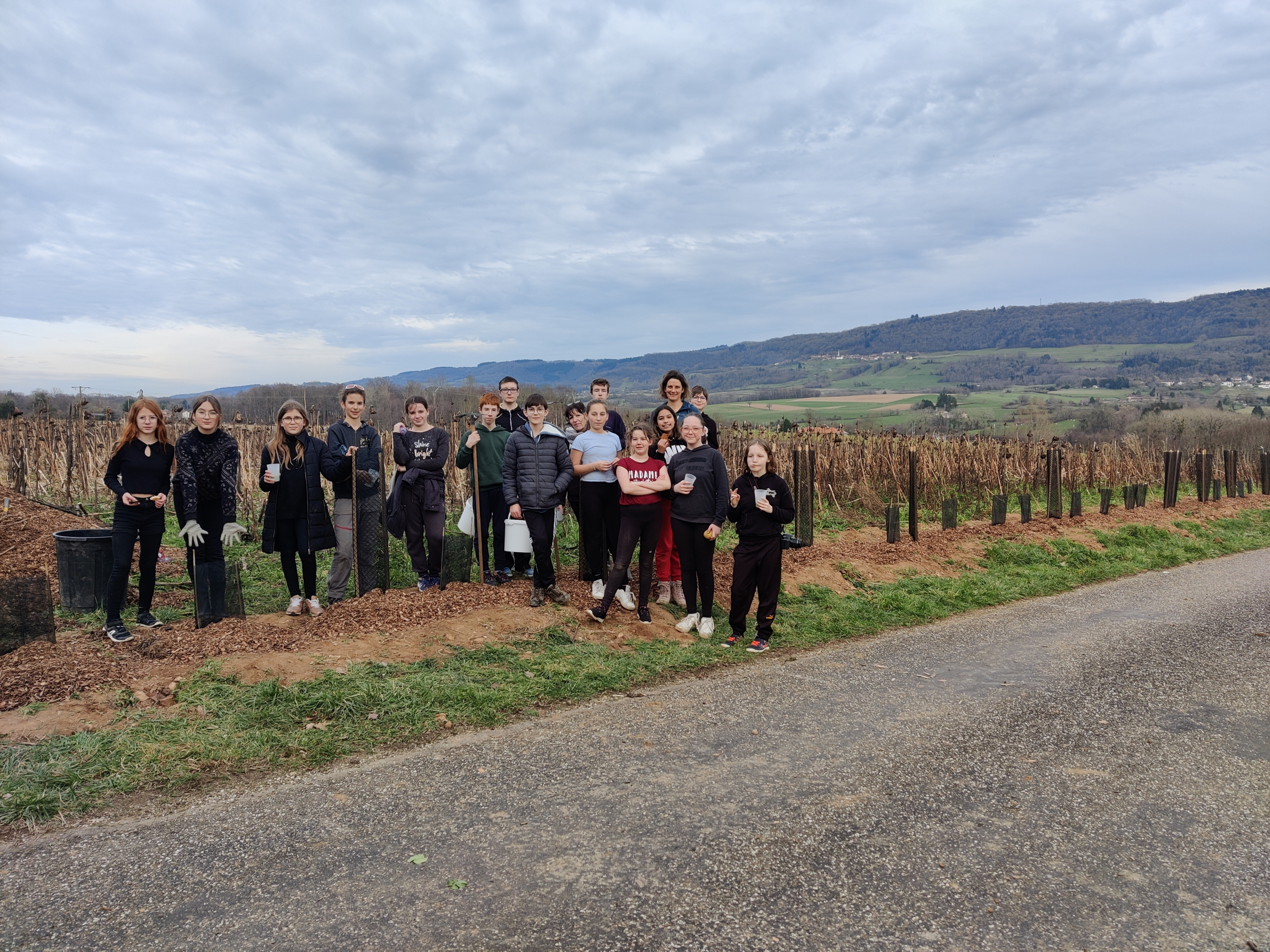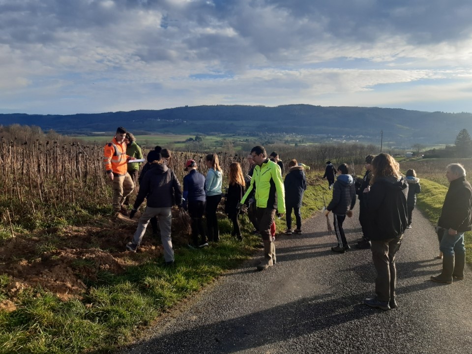 Au programme, habillage et pralinage des plants, répartition sur le linéaire, mise en terre, mise en place des protections contre le gibier et paillage (un volume de 25m³ a tout de même était nécessaire). Les collégiens en sont ressortis fatigués et courbaturés mais surtout très fiers et satisfaits ! La réussite de ce projet n’a été possible qu’avec l’appui de la commune de Coligny, dans le département de l’Ain ainsi que des propriétaires exploitants de la parcelle, associés de l’EARL la Grange Bouquet.